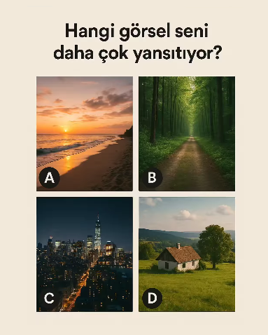 D) Kırsal Ev > Yorum: Sadelik ve güven arıyorsun. Duygusal olarak istikrar senin için önemli. Güçlü aile ve aidiyet duyguları taşıyorsun. Hayatında köklenmek, sakinlik ve netlik istiyorsun. İç huzurun dış başarıdan daha önemli olabilir.