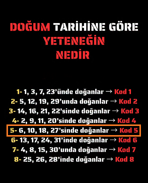 5-Senin yeteneğin, doğal liderlik özelliklerinde yatıyor. Kendine güveniyorsun, önemli kararlar alabiliyor ve başkalarına yol gösterebiliyorsun. Liderlik becerilerin sayesinde yüksek başarılar elde ediyor ve hedeflerine ulaşıyorsun.