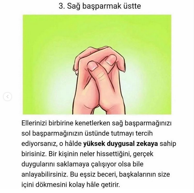 Parmaklarınızı sıkarken sağ baş parmağınızı sol parmağınızın üstünde tutmayı tercih eden biriyseniz, duygusal oluşunuz dikkat çekicidir. Bir insanın gerçek duygularını saklamaya çalışırken bile ne hissettiğini anlayabilirsiniz. Bu eşsiz yetenek, başkalarının size açılmasını kolaylaştırır. Bu yeteneğiniz size ayrıca olaylara başka bir pencereden bakma şansı veriyor. Sorunlara başkalarının göremediği bir pencereden bakmanız ve herkesten farklı şekilde düşünmeniz doğru kararları vermenizi sağlayan bir bakış açısı sunar. İlişkilerde sevgilinizin dile getirmediği duygularını da anlayabiliyorsunuz. Asla sorun çıkaran taraf değilsiniz ve partnerinizi duygusal açıdan tatmin etmeyi başarıyorsunuz.
