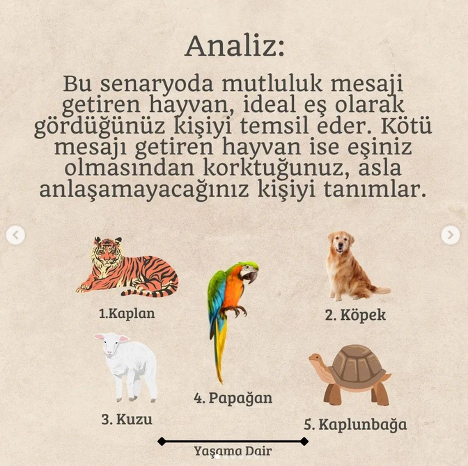 Seçtiği eş çoğu kişinin geleceğini etkiler. Hayvanlarla ilgili olumlu ve olumsuz çağrışımlarınız, psikolojik açıdan zengin anlamlar taşır.