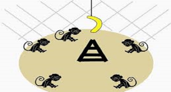 Kafese en son gelen bu iki maymun, muzları görünce hemen merdivene koşarlar. Fakat, kafese bu iki maymundan daha önce gelipte aynı hareketi yaptıklarında önceki diğer maymunlar tarafından dövülen ve niçin dövüldüklerini bilmeyen maymun A, B ve C, bu yeni gelen maymun D ve E`yi, kendileri daha önce nasıl dövüldülerse aynen o şekilde döverler.