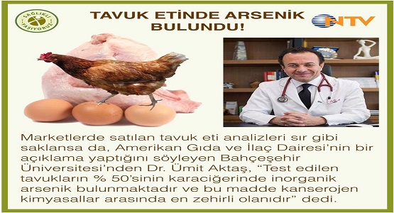 Marketlerde satılan tavuk eti analizleri sır gibi saklansa da, Amerikan Gıda ve İlaç Dairesi’nin bir açıklama yaptığını söyleyen Bahçeşehir Üniversitesi’nden Dr. Ümit Aktaş , “Test edilen tavukların % 50’sinin karaciğerinde inorganik arsenik bulunmaktadır ve bu madde kanserojen kimyasallar arasında en zehirli olanıdır” dedi.