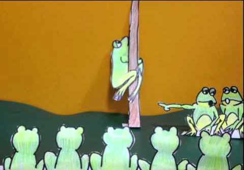 Yarışmaya başlayan kurbağalar, kulenin tepesine ulaşamayınca teker teker yarışı bırakmaya başlamış.