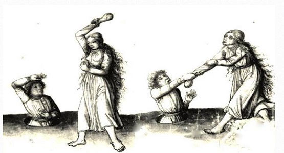 İş aralarındaki çekişmeyi çözmeye gelince Orta Çağ’daki Alman çiftler zaman kaybetmiyordu. İki normal insan gibi tartışmak yerine, şiddete başvurmayı tercih ediyorlardı. Tek seferlik dövüşmeden oluşan mahkemeler çiftlerin aralarındaki anlaşmazlıkları çözmenin yaygın bir yoluydu ve bir karı koca dövüşmeye başladığı zaman işin içine erkeğin tek eli arkasında bir çukurun içine ayakta durması kadının ise içi taş dolu bir torbayla etrafında koşması gibi tuhaf sınırlamalar getiriliyordu.
