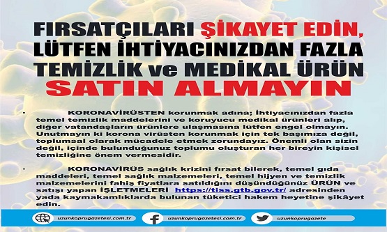 • Koranavirüs sağlık krizini fırsat bilerek, temel gıda maddeleri, temel sağlık malzemeleri, temel hijyen ve temizlik malzemelerini fahiş fiyatlara satıldığını düşündüğünüz ÜRÜN ve satışı yapan İŞLETMELERİ https://tiss.gtb.gov.tr/ adresinden yada kaymakamlıklarda bulunan tüketici hakem heyetine şikâyet edin.
