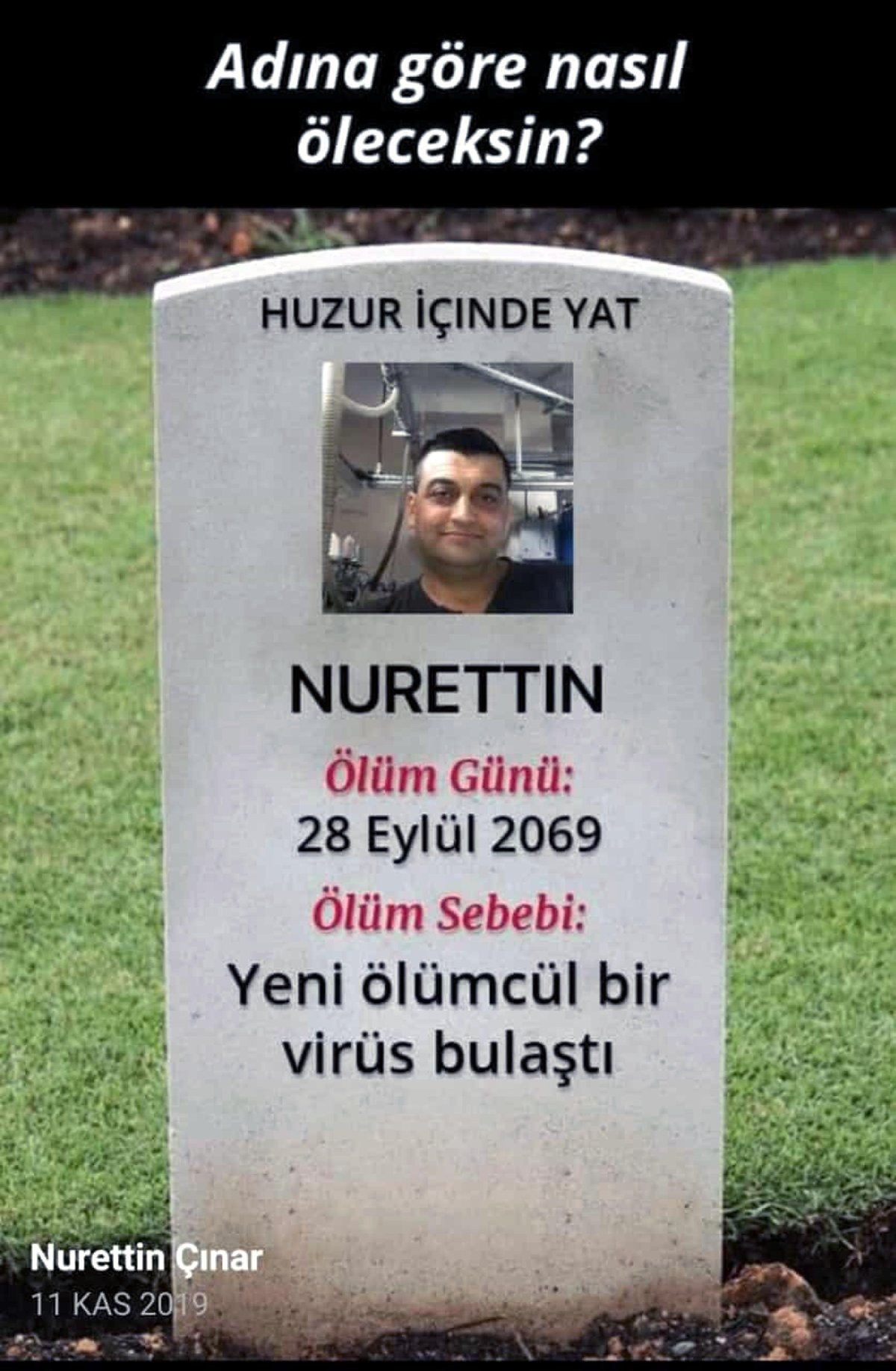 Nurettin Çınar’ın, geçen yıl 11 Kasım’da sosyal medya hesabında, “Adına göre nasıl öleceksin” uygulamasının “ölümcül bir virüs” yazan sonucunu paylaştığı görüldü.