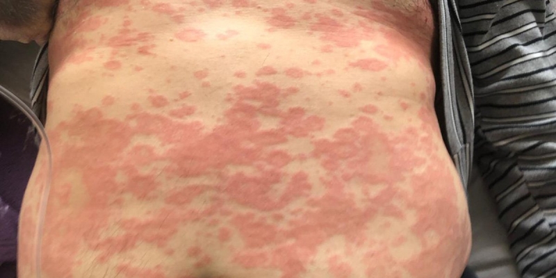 İkinci sırada yüzde 23 oranında karşımıza çıkan bizim ‘makülopapüler’ dediğimiz, tüm vücutta 5-6 milimetre çapına ulaşabilen deriden kabarık, kısmen deri seviyesinde olan, bazen kepekli kabuklanma da yapabilen döküntülerdi. Bunlar daha çok gövdede ve kollar ile bacakların üst kısımlarında mevcuttu.