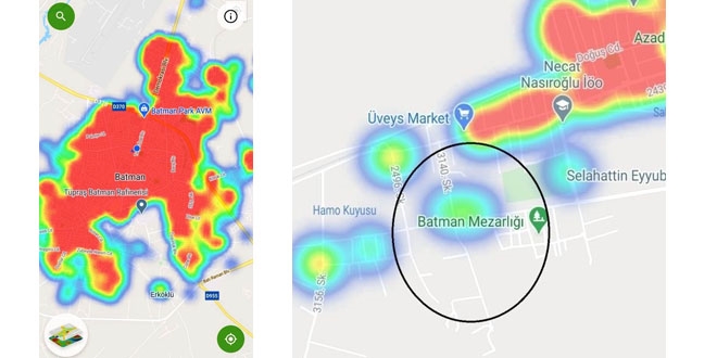 Sağlık Bakanlığının mobil uygulaması olan 'Hayat Eve Sığar' (HES) uygulamasında korona virüs vak'alarının bulunduğu riskli alanları gösteren Batman'ın risk haritası her geçen gün kırmızıya dönüşürken, harita üzerinde en güvenli bölgelerden birinin 'Asri Mezarlık' olması dikkat çekti. Vatandaşlardan Mustafa Seven, "Burası Batman Asri Mezarlığı, Sağlık Bakanlığının mobil uygulaması 'Hayat Eve Sığar' uygulamasında il haritası veriliyor, orada vak'aların il haritasına yansıması gösteriliyor. Harita Batman'da son günlerde artan korona virüs vak'alarının ardından neredeyse tamamen kırmızıya büründü, yalnız haritanın bir bölümünde Asri Mezarlık temiz gözüküyor. Yani anlayacağınız haritada en güvenli yer asri mezarlık gözüküyor. Bu nedenle insanların gönül rahatlığıyla gelip ölmüşleriyle hasbihal edebilecekleri Fatiha okuyabilecekleri en güvenli yer burası görünüyor. Haritanın geri kalan tamamı kırmızıya büründü" dedi.