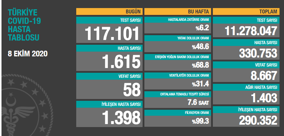 Bugün 1.615 hasta tespit edildi. Ağır hasta sayımızda düşüş eğilimi devam ediyor. Salgını kontrol altında tutacak olan filyasyon ve izolasyon. Tedbirlere uyarsak buna gerek kalmayacak. Salgını birlikte kontrol altında tutabiliriz. Bu mücadeleye güç verin. http://covid19.saglik.gov.tr