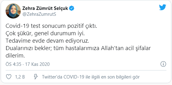 Bakan Zehra Zümrüt Selçuk koronavirüs testinin pozitif çıktığını duyurdu. Son dakika haberi: Aile, Çalışma ve Sosyal Hizmetler Bakanı Zehra Zümrüt Selçuk, corona virüs testinin pozitif çıktığını duyurdu. Ayrıntılar geliyor...