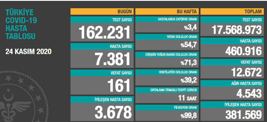 Bugün tespit edilen 7.381 yeni hastamız var. Ağır hasta sayımız 4.543’e ulaştı. Salgının seyrini değiştirmek elimizde. Aldığımız tedbir ve kısıtlamaların daha iyi ve hızlı netice vermesi için desteğiniz şart. Zorunlu olmadıkça kalabalıklardan uzak durun. http://covid19.saglik.gov.tr